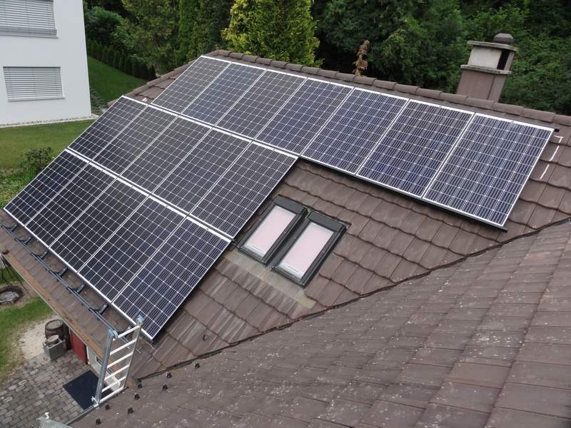 Solarstromanlage mit 14.4 kWp Nennleistung und Solar Batterie mit 12 kWh sowie intelligentem Überschuss-Verbrauchsregler zur Warmwasseraufbereitung und Steuerung der Ladestation. Aufdach.